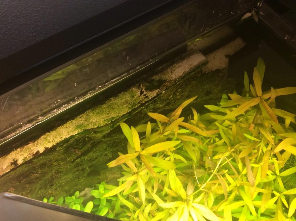 Mi sembra che la situazione sia migliorata molto,vedo piante in buona forma e alghe in ritirata,anche la tua prediletta e' in ottimo stato,ma aspetterei ancora un po',prima di reciderla
